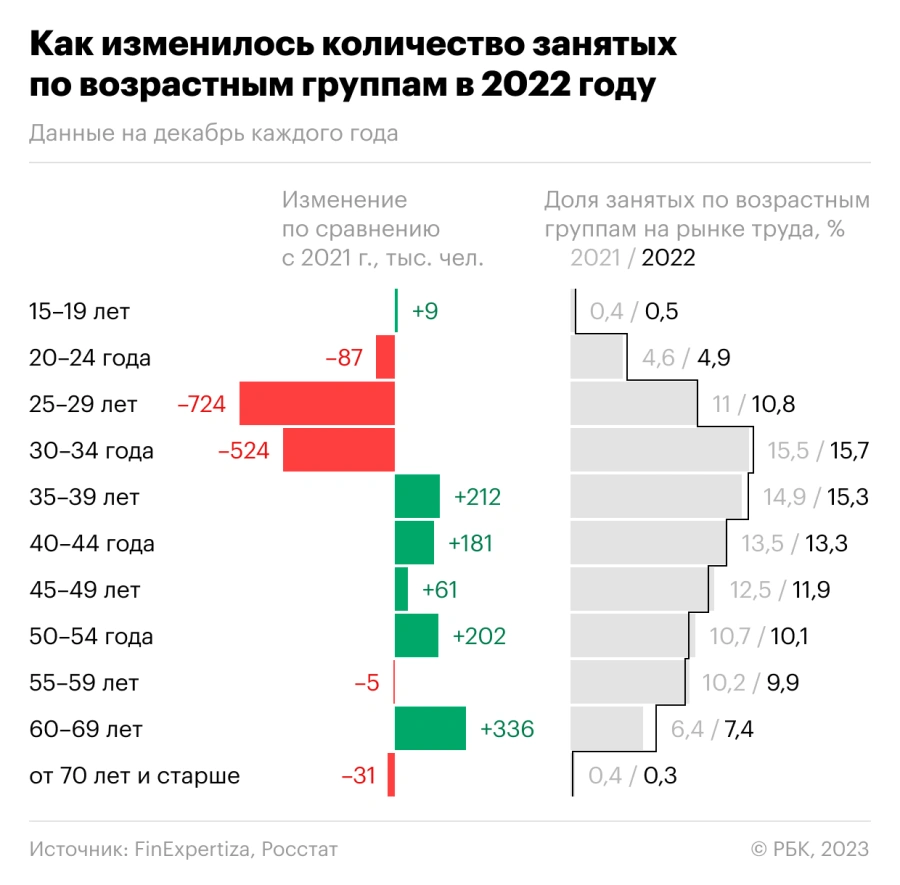 В результате в декабре 2022 года количество молодых работников на рынке труда составило 21,5 млн человек, или 29,8% всех занятых, — это минимум за весь период доступной статистики (с 2006 года). Однако с учетом того, что старение населения и рабочей силы начало активно проявляться еще с 1990-х годов, можно говорить о том, что численность занятой молодежи опустилась до минимума за всю новейшую историю страны, полагают в FinExpertiza.